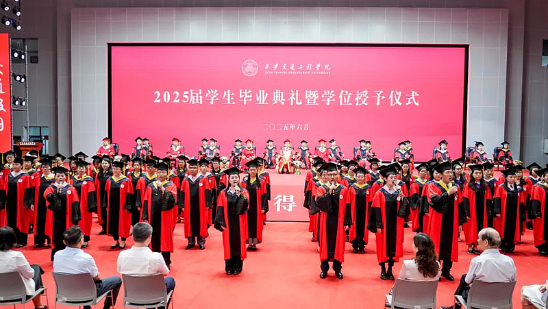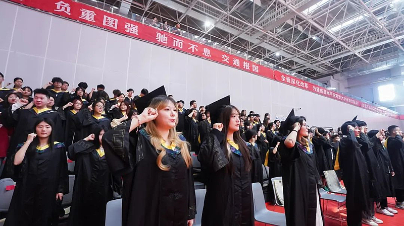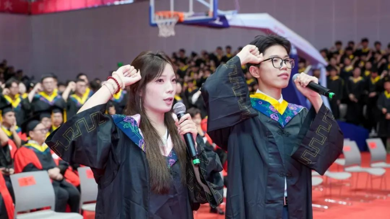 誓言铿锵,信念如磐。全体毕业生举起右拳庄严宣誓。典礼尾声,校歌《创造新时代的辉煌》旋律如常,全体毕业生用歌声表达着对母校浓浓的眷恋之声。