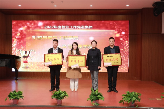 执行校长曹庆年宣读了就业工作表彰决定,对机械与电气工程学院等3个“2022年度就业工作先进集体”,王冲等 8名“2022年就业工作先进个人”;赵德浩等6名“2022 年度简历设计大赛优秀指导教师”,交通运输学院等2个“访企拓岗先进集体”分别予以表彰。