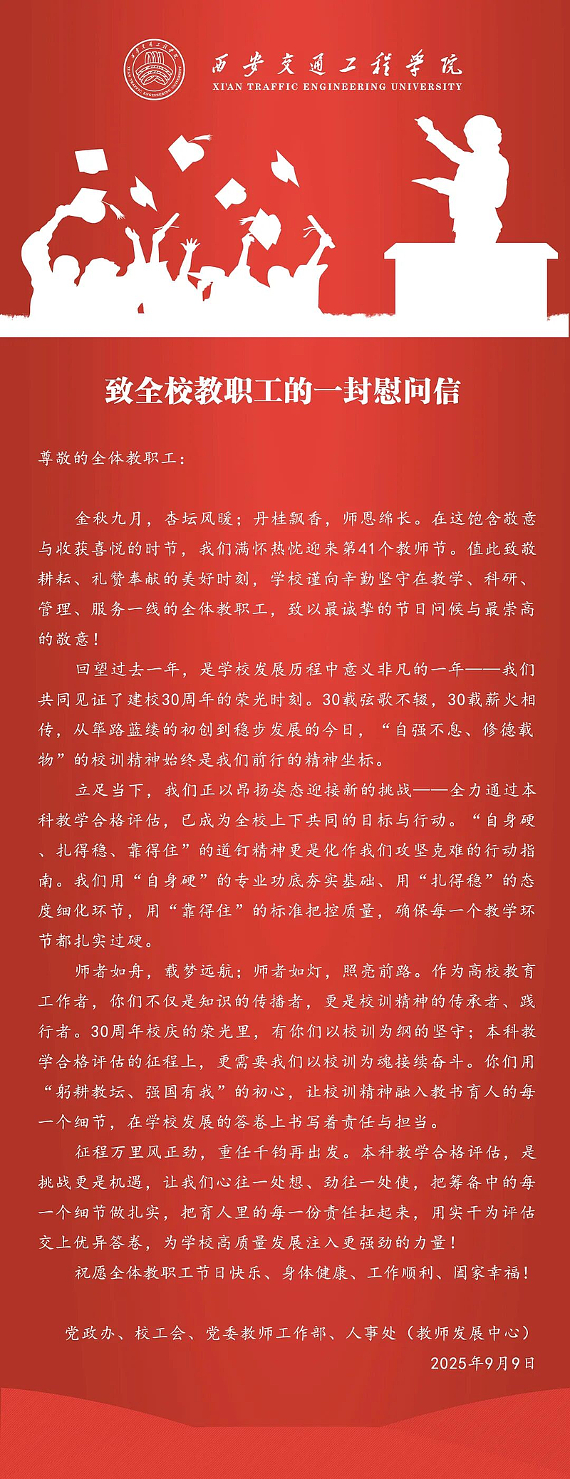 金秋九月,杏坛风暖;丹桂飘香,师恩绵长。在这饱含敬意与收获喜悦的时节,我们满怀热忱迎来第41个教师节。值此致敬耕耘、礼赞奉献的美好时刻,学校谨向辛勤坚守在教学、科研、管理、服务一线的全体教职工,致以最诚挚的节日问候与最崇高的敬意!