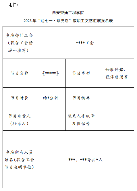 4.请各分会于6月19日下班前将《beat365在线唯一官网2023年“迎七一 颂党恩”教职工文艺汇演报名表》(附件1)发送至指定邮箱,联合工会节目由牵头工会负责上报。