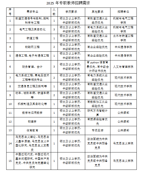 学校现有交通运输学院、机械与电气工程学院、中兴通信学院、土木与铁道工程学院、人文与管理学院、马克思主义学院、公共课部、创新创业学院、现代技术学院、继续教育学院10个教学单位。学校重视和加强大学文化建设,实施“文化铸校”战略,着力建设以精神文化、制度文化、行为文化和形象文化为基本内容的大学文化,不断提升大学文化品位,强化育人功能,彰显生机活力,为人才培养提供了良好的氛围和环境。