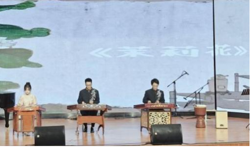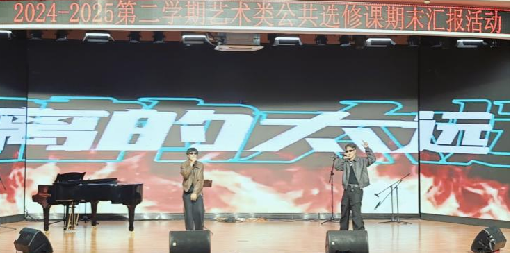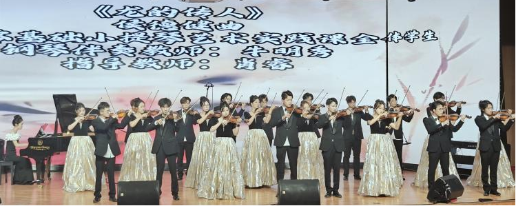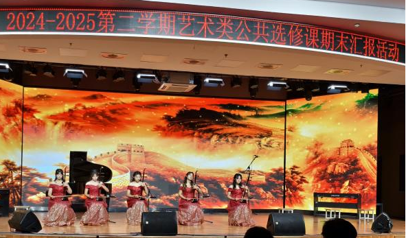 汇演现场,琴弦与歌喉共鸣,传统与现代交响。首先,声乐艺术实践课的学生以深情动人的合唱《稻香》拉开序幕,唤起听众美好的童年记忆。随后,西方古典的优雅旋律交织响起,钢琴与小提琴艺术实践课的学生们激情演奏了钢琴六手联弹《钟》、小提琴齐奏《龙的传人》以及师生二重奏《D大调卡农》等作品。二胡、古筝、扬琴则以多样的表演形式流淌出浓郁的东方韵味,精彩呈现了如二胡齐奏《东方红》、古筝三重奏《碟》、扬琴重奏与打击乐《小白船》等经典与现代曲目。其间,吉他演奏则洋溢着青春的活力与自由,既有唤醒青春的吉他弹唱《找自己》,又有热情绽放的电吉他独奏《青鸟》。另外,此次汇演还特别增设了唐诗朗诵节目,一首《琵琶行》以声传情,带领观众穿越千年时空,感受中华语言艺术的恒久魅力。
