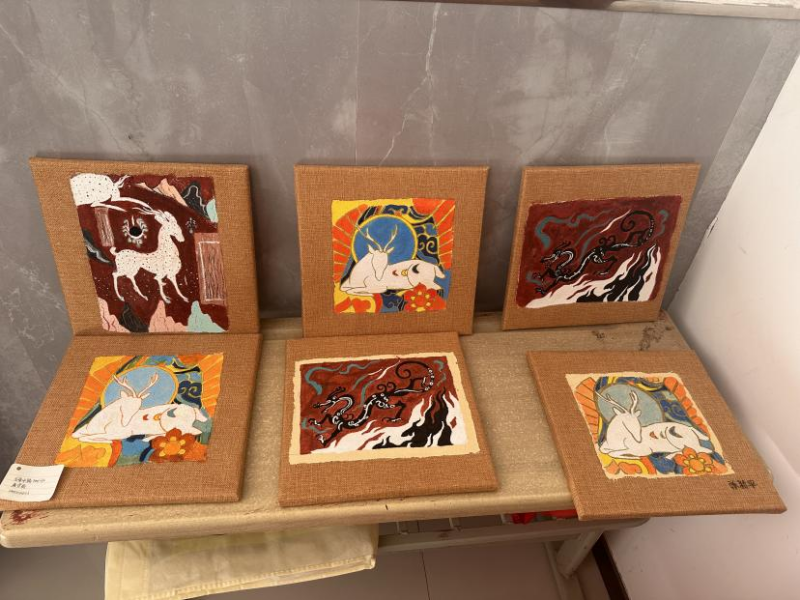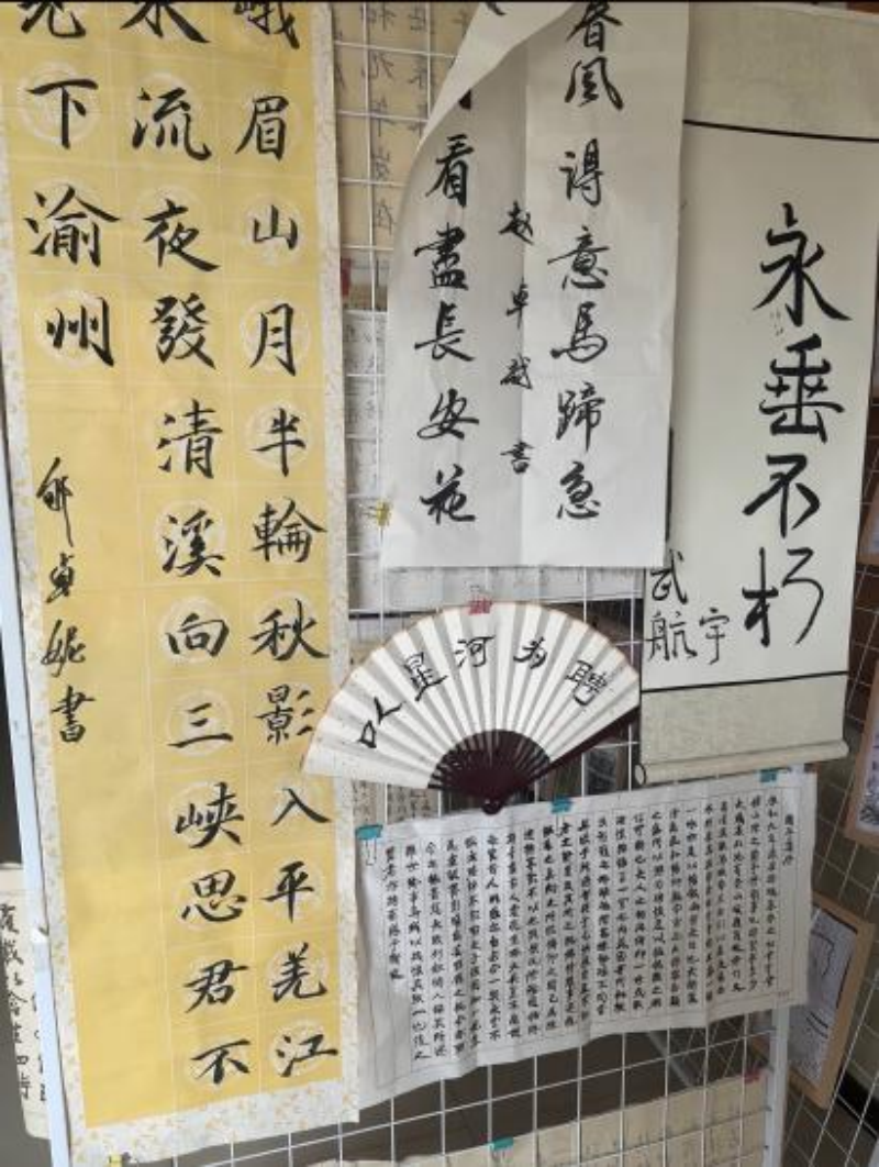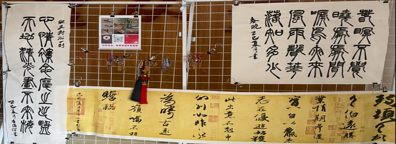 与此同时,作品展览区域同样引人驻足。笔墨丹青的书法作品或苍劲有力,或娟秀灵动;装饰图案设计构思巧妙,色彩斑斓;非遗结绳技艺精巧,寓意深远;“十大非遗艺术体验”成果展区更如同微型文化长廊,集中展示了beat365学子在沉浸式非遗体验课程中的学习结晶,体现了对中华优秀传统文化根脉的守护与创新。