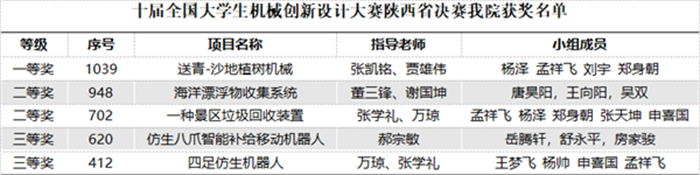 6月18日至19日,由陕西省教育厅和第十届全国大学生机械创新设计大赛陕西赛区组委会主办的第十届全国大学生机械创新设计大赛陕西赛区竞赛在西安科技大学临潼校区骊山校园举办。本届大赛以“自然·和谐”为主题,共有来自西北工业大学、西安交通大学、西安电子科技大学、长安大学等50余所高校的484项作品参与角逐,参赛学生人数近3000人。专家评委经过为期两天的三轮评审,机械与电气工程学院9件参赛作品荣获一等奖1项,二等奖2项,三等奖2项。
