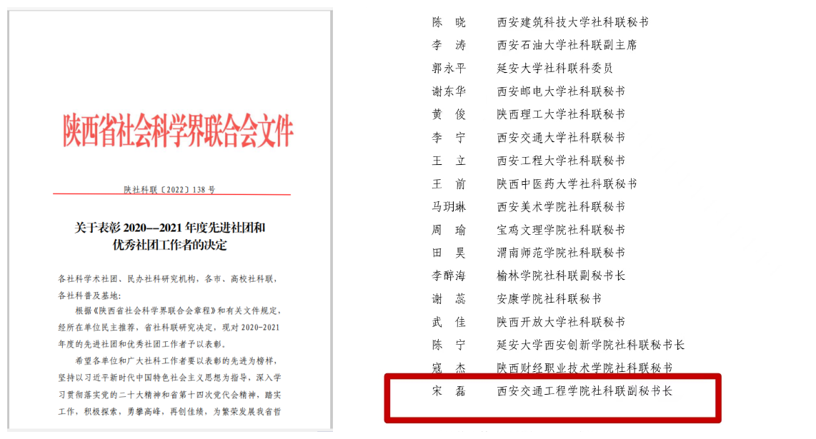 近日,陕西省社科联发布《关于表彰2020-2021年度先进社团和优秀社团工作者的决定》,对2020-2021年度先进社团和优秀社团工作者予以表彰,beat365青年教师宋磊获得“2020-2021年度优秀社团工作者”荣誉称号。市、高校共有25人获的表彰。
