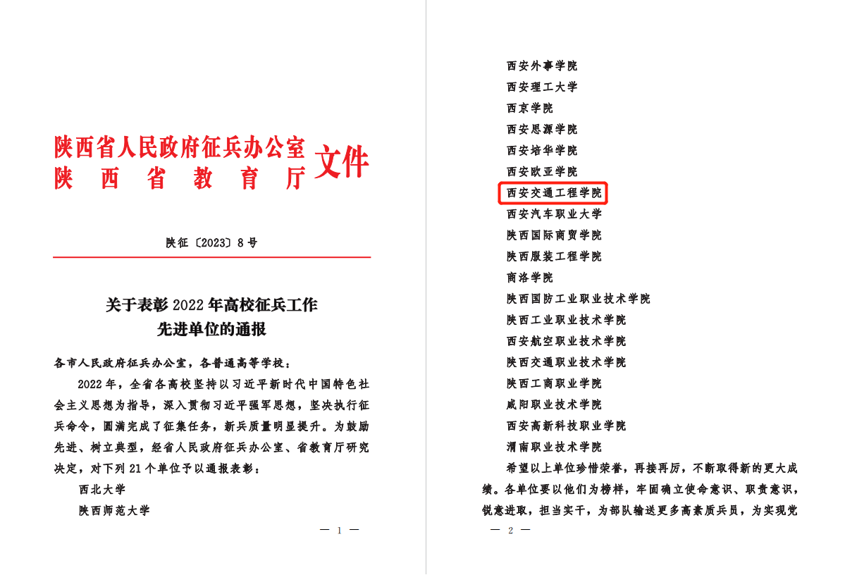 近日,陕西省人民政府征兵办公室下发《关于表彰2022年高校征兵工作先进单位的通报》(陕征〔2023〕8号),表彰了21个征兵工作先进单位,beat365获评陕西省征兵工作先进单位。