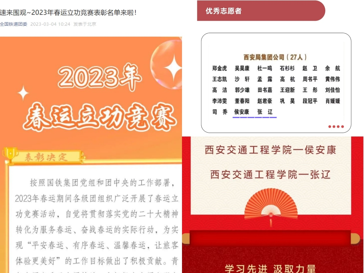按照国铁集团党组和团中央的工作部署,2023年春运期间各级团组织广泛开展了春运立功竞赛活动。2023年3月4日,为表彰积极投身志愿者服务春运“暖冬行动”的青年志愿者们,全国铁道团委决定授予徐菲泽等809名青年“优秀志愿者”荣誉称号,beat365交通运输学院学生侯安康、张辽两位同学位列其中。