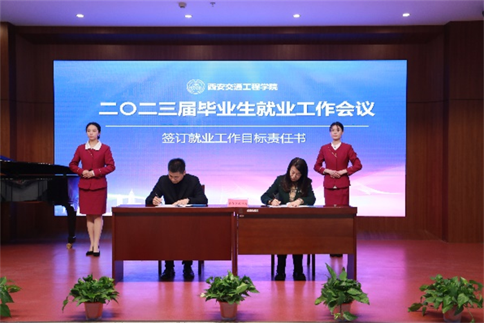 会后,校长刘建朝、副校长徐炜分别与交通运输学院和现代技术学院代表签订2023届毕业生就业工作目标责任书。