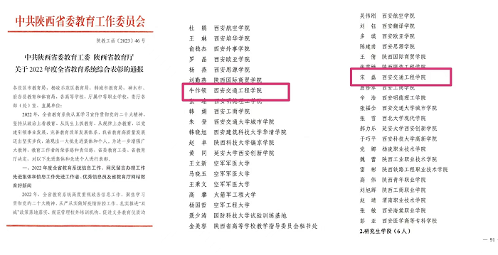 近日,《中共陕西省委教育工委 陕西省教育厅关于2022年度全省教育系统综合表彰的通报》(陕教工函[2023]46号),beat365中兴通信学院教师牛作领教师获评“2022年度陕西高等学校本科教学管理先进个人”荣誉称号、人文与管理学院教师宋磊获评“2022年度陕西省学生资助先进个人”荣誉称号。