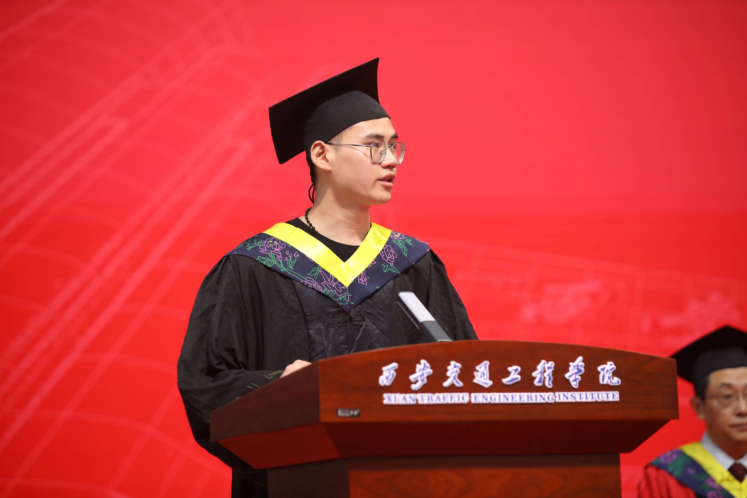 典礼上,毕业生代表怀着感恩之情手捧鲜花走上主席台,为学位评定委员会全体成员献花并深情拥抱;接着为毕业生们现场献歌,演唱歌曲《少年》、《飞云之下》;现场全体毕业生集体宣誓,立下铮铮誓言,传承西交院大学精神,要用智慧和才华肩负起民族复兴的使命,用青春和热血承担起国家富强的责任。