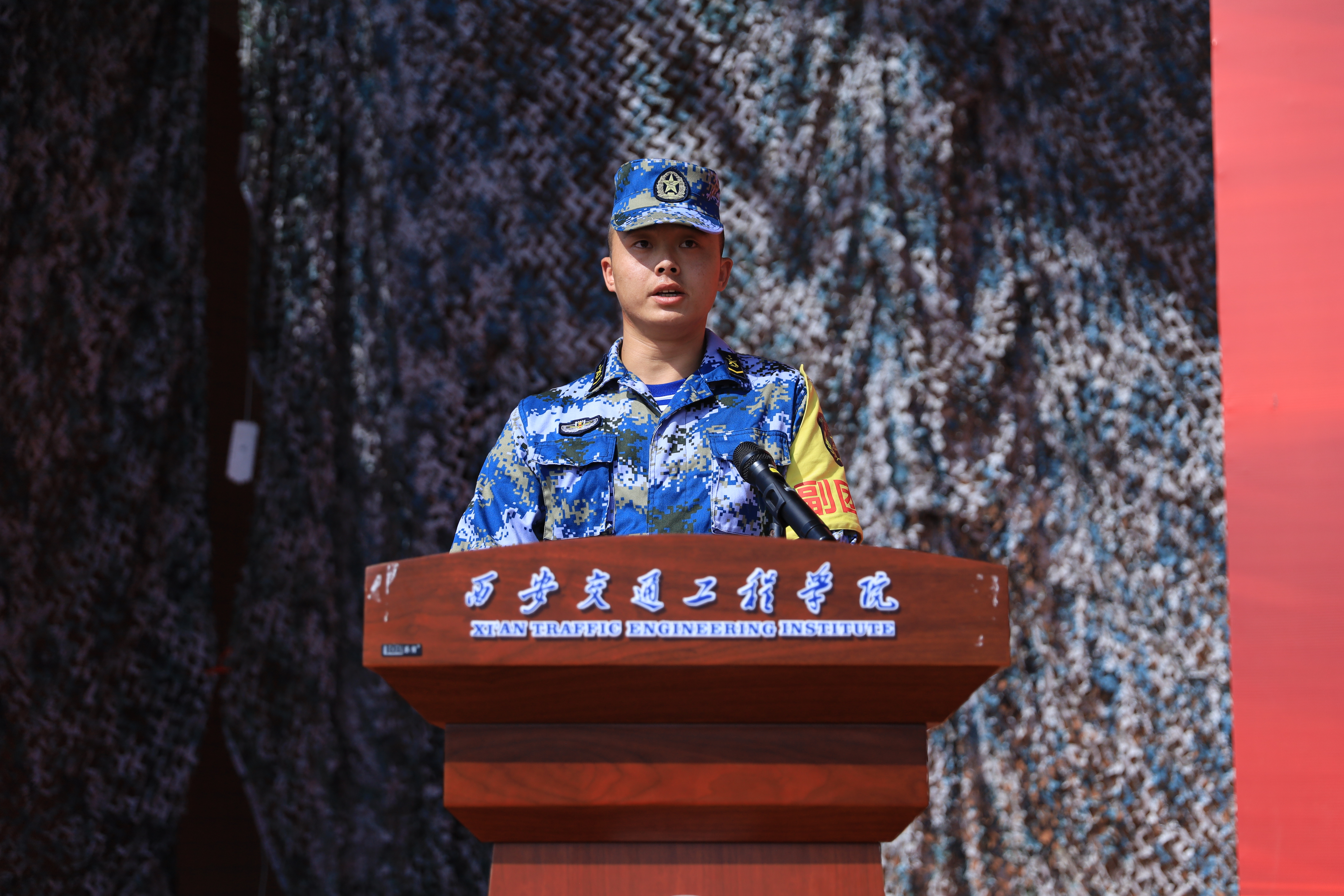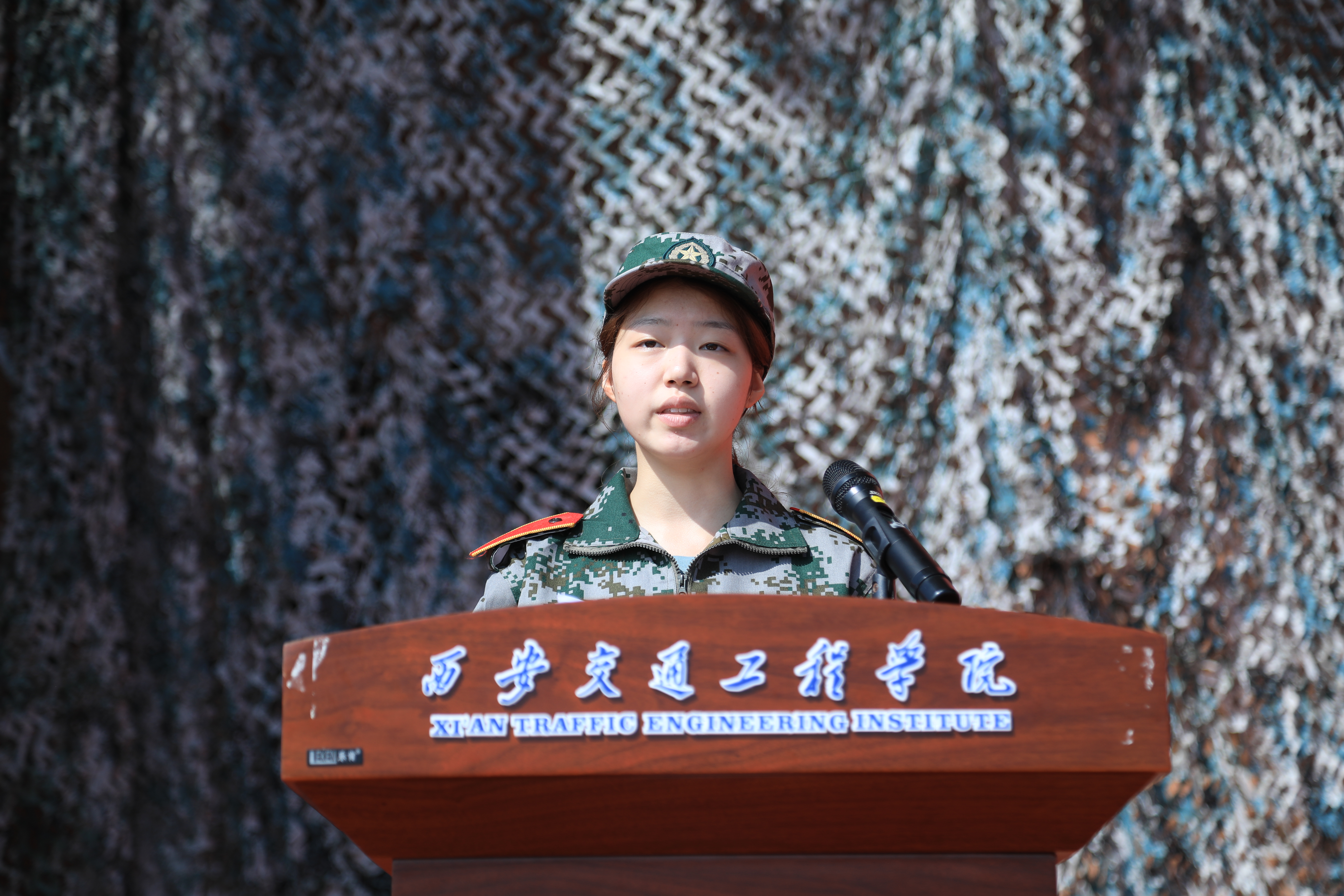 参训新生马明琦代表军训学员发言,她郑重承诺,听从指挥、严守纪律,勇于迎接军训挑战,磨砺军人品格,展现出新一级现代学子奋发向上的青春风貌。