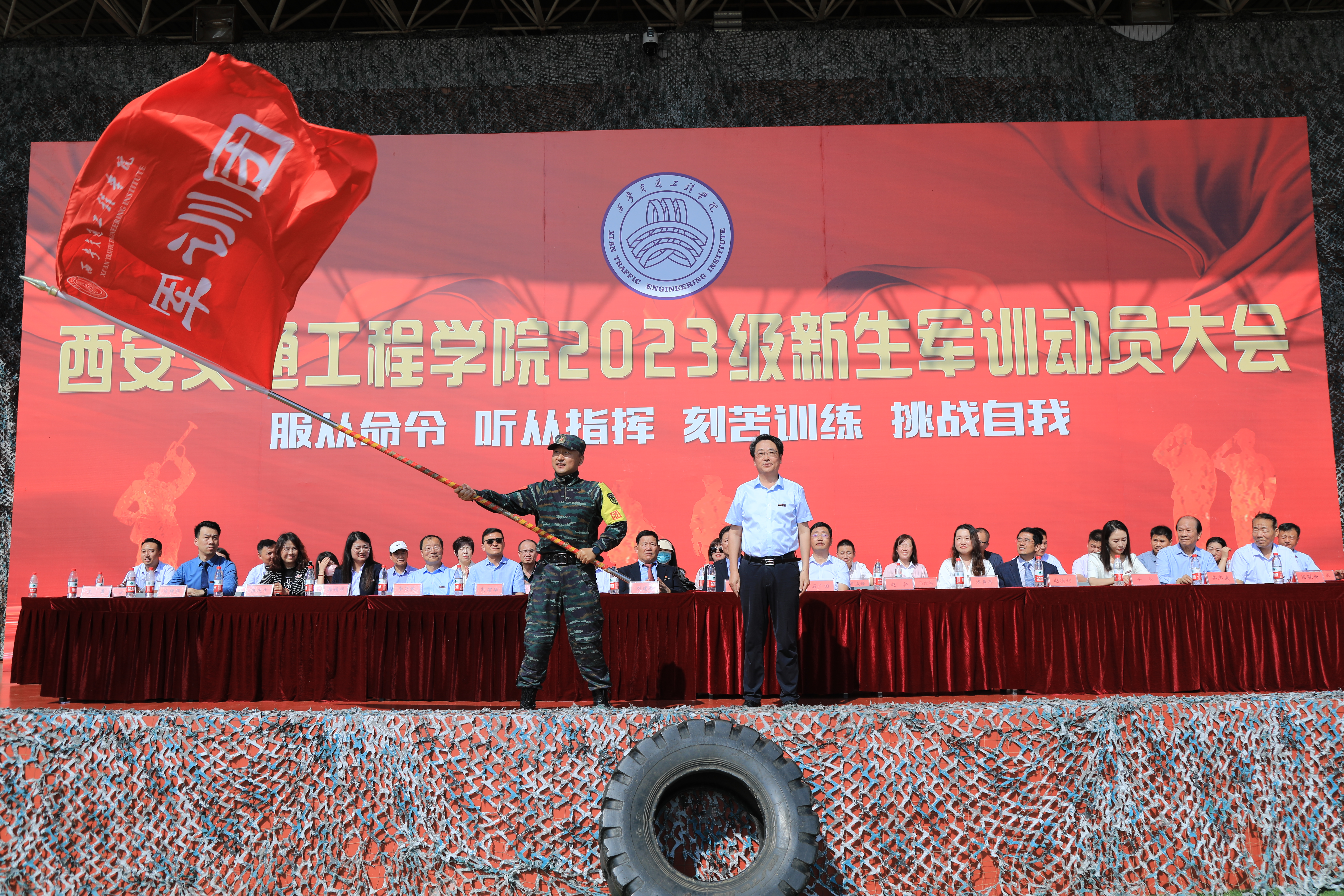 执行校长曹庆年向2023级新生军训团授旗