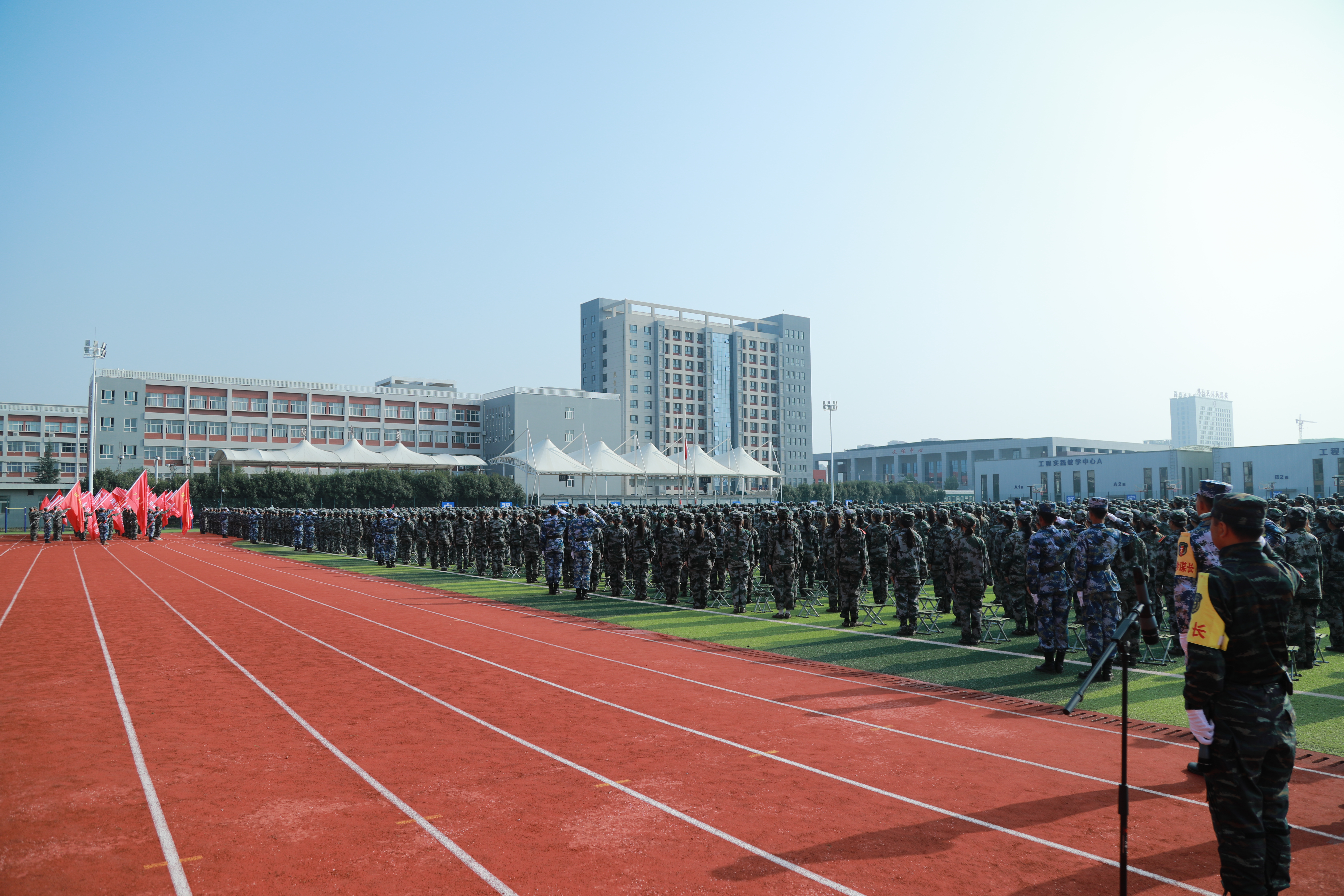 脚踏晨风,面向朝阳,上午8时40分,典礼正式拉开帷幕,全场师生、教官庄严肃穆,面向国旗,奏唱国歌。