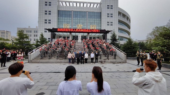 王勇副校长在讲话中深情回顾了祖国74年来走过的风雨历程和取得的伟大成就,激励青年学子在民族复兴的赛道上奋勇争先。他勉励广大青年学子要厚植家国情怀、涵养进取品格,以奋斗姿态激扬青春,不负时代,不负华年。要以爱国报国为己任,牢固树立远大理想,常怀报国志之,荣校爱校,并向同学们提出了三点希望:一是坚定理想信念、树牢奋斗之志,作为新时代青年大学生,你们要坚持读原著学原文悟原理,用好形式多样的学习资源,以理想之光照亮奋进之路,在全面推进中华民族伟大复兴的新征程上涌流出源源不断的青春力量。二是练就过硬本领,夯实奋斗之基,勉励同学们要积极参与社会实践,特别是要深入基层,深入群众,深入到社会一线的伟大实践中,以此加深对社会的认识,对祖国的理解,引发对中华民族未来发展的深刻思考。三是勇于担当奉献、绽放奋斗之花。作为当代青年大学生,要争当先锋模范、勇于担当奉献,在传播党的声音、规范日常行为、搞好志愿服务、遵守校规校纪等方面发挥模范带头作用,带头用党的创新理论武装思想,带头用党的初心使命激励自己,带头听党话、跟党走,带头增强“四个意识”、坚定“四个自信”、做到“两个维护”。学习上要自觉做到“没有最好、只有更好”,努力学以增智、学以广才、学以修身、学以致用;生活中做到严于律己、遵规守纪,担负起青年大学生应尽的责任义务;学风建设上要知行合一、以身作则,积极发挥模范带头作用。