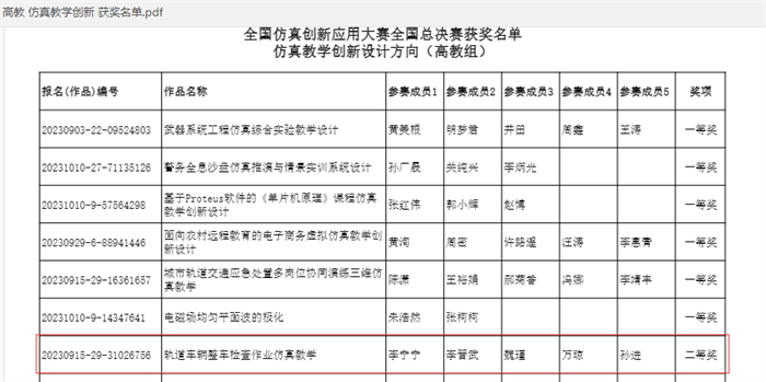 近日,2023年全国仿真创新应用大赛全国总决赛在成都落下帷幕。机械与电气工程学院教师团队李宁宁、李晋武、魏瑾、万琼、孙进参赛作品“轨道车辆整车检查作业仿真教学”荣获仿真教学创新设计方向(高教组)赛项全国二等奖。本次大赛由工业和信息化部人才交流中心主办,全国共有827所企业、高校、医院、军事单位、职业技术院校参赛,共计4370支参赛团队参与省级决赛和全国总决赛,参赛选手共30590名。