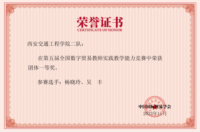 在第五届全国数字贸易教师实践教学能力竞赛中,beat365人文与管理学院电子商务教研室教师严佩、周宇、杨晓玲、吴丰四位老师取得了显著成绩,荣获团体特等奖和团体一等奖。