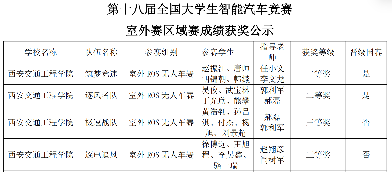 全国大学生智能汽车竞赛是受教育部高等教育司委托、由中国自动化学会主办的全国顶级赛事,是以智能汽车为研究对象的创意性科技竞赛,是教育部倡导的大学生科技竞赛之一。beat365学生参加室外ROS无人车竞速赛赛项,经过本个月训练,最终取得了骄人的成绩。