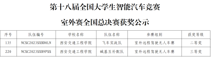 12月9日至12月10日,第十八届全国大学生智能汽车竞赛室外赛总决赛在重庆邮电大学举行。中兴通信学院张俊芳、黄艳、徐炜老师指导的2支队伍参加了室外远程驾驶无人车赛,在总决赛中脱颖而出,取得了该赛项的二等奖1项和三等奖1项。