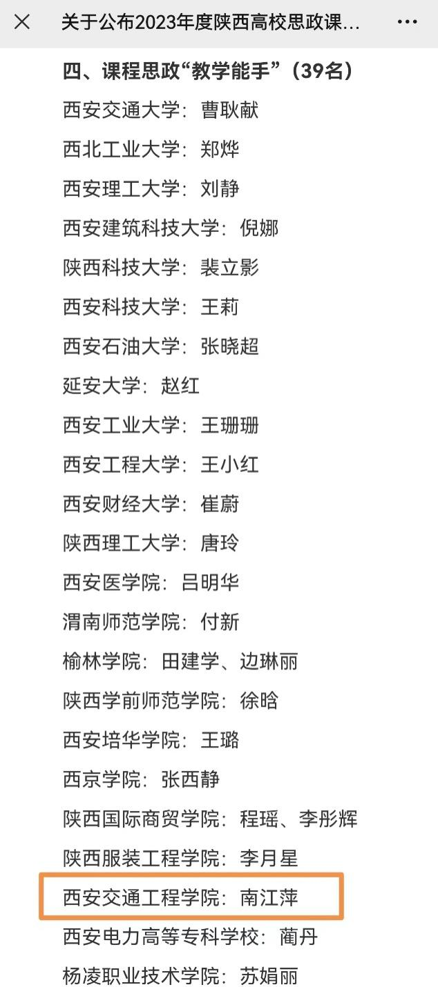 根据《关于开展2023年度陕西学校思政课教师 “大练兵”省级展示活动的通知》(陕教工宣办〔2023〕33号)和《关于举办2023年度陕西高校思政课程课程思政教师“大练兵”省级现场展示活动的通知》(陕教工宣办〔2023〕35号)安排,经高校推荐、网络初评、现场展示、专家评审等环节,陕西省教育厅于2023年12月22日确定了2023年度陕西高校思政课程课程思政教师“大练兵”省级展示结果,其中,beat365机械与电气工程学院电气工程教研室南江萍老师荣获省级“教学能手”称号。