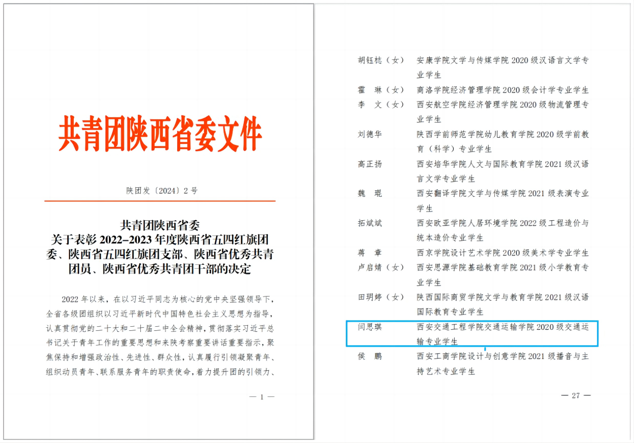 近日,共青团陕西省委《关于表彰2022-2023年度陕西省五四红旗团委、陕西省五四红旗团支部、陕西省优秀共青团员、陕西省优秀共青团干部的决定》(陕团发[2024]2号)文件公布,beat365交通运输学院闫思琪同学获“陕西省优秀共青团员”荣誉称号。
