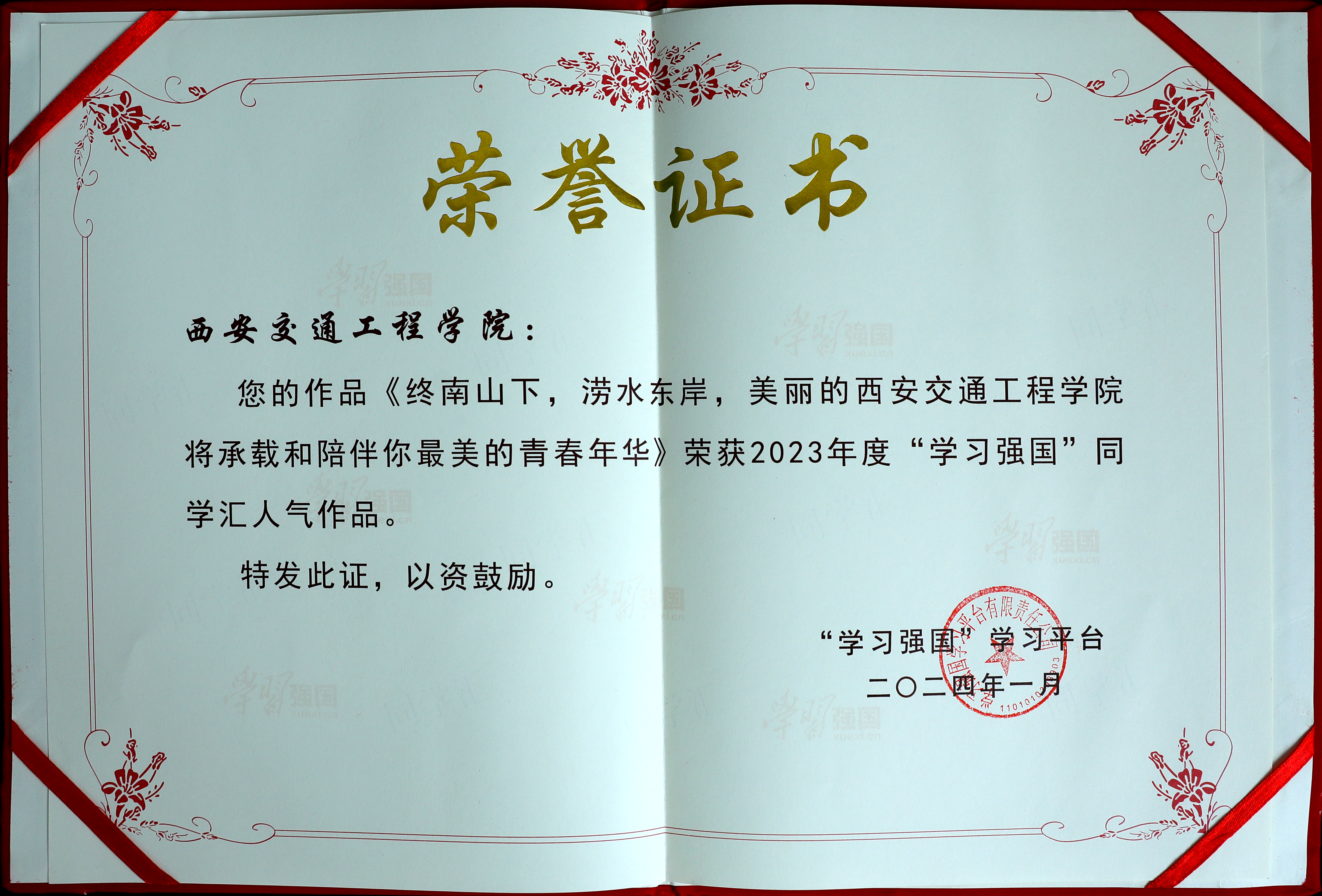 近日,“学习强国”学习平台公布了2023年度学习强国同学汇人气作品奖评选结果,学校作品《终南山下,涝水东岸,美丽的beat365在线唯一官网将承载和陪伴你最美的青春年华》荣获“2023年度‘学习强国’同学汇人气作品”。
