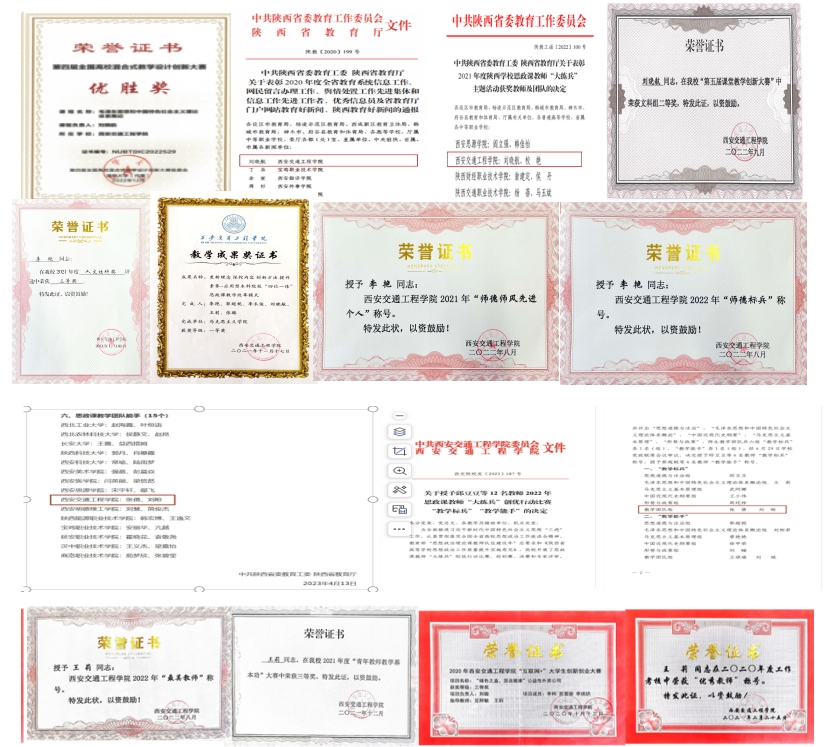 2、扎实开展教学改革。遵照《讲话》“抓好教学目标设计、课程设置、教材编写、教学改革”及“推动思想政治理论课改革创新,不断增强思政课的思想性、理论性和亲和力、针对性”的指示精神,马克思主义学院各教研室不断补充、丰富6门思政课程的教学内容。编撰《教学参考资料》5本。学院教师积极参加陕西省思政课“大练兵”活动、学校 2022年度课堂教学创新大赛、学院课程创新大赛、学院青年教师基本功大赛等,刘晓航获全国教学创新优秀奖,刘晓航、程天宇分别获教育部“第四届全国混合式教学大赛”优胜奖;刘晓航团队(2人)张倩团队(2人)分别获2022年、2023年陕西省思政课教师“大练兵”教学能手称号;王莉等12名教师荣获 2022、2023年度校级思政课“大练兵”教学标兵”称号:曹晓莉获评2020年度陕西省“师德标兵”称号;李艳获评2022年度学校师德标兵称号,王莉获评2022年学校最美教师称号,郭超妮获评2022年度学校师德先进个人称号。基础与概论教研室党支部获评省级样板党支部,现正申报全国样板党支部。