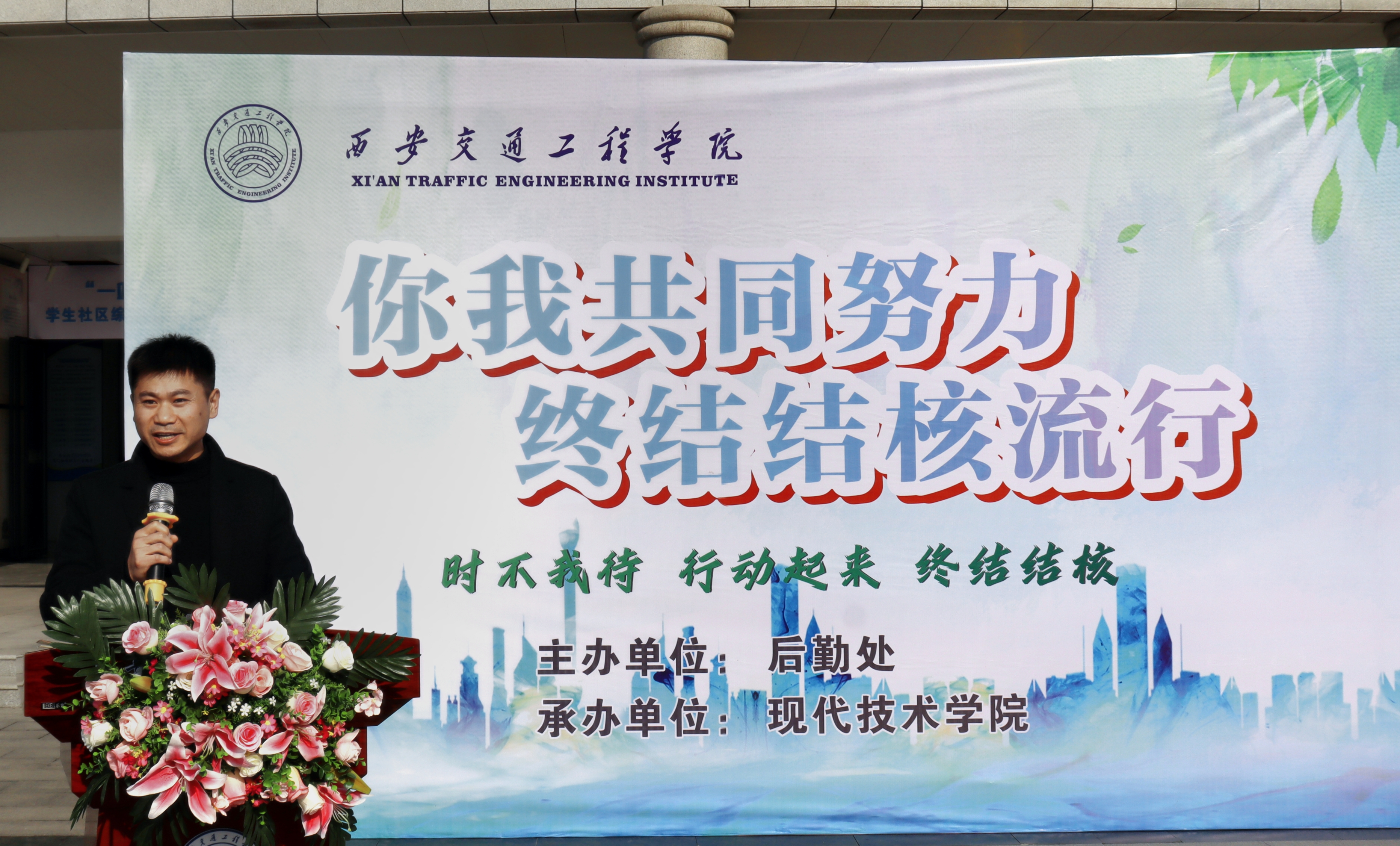 为进一步加强教育强国和健康中国理念教育,将健康理念贯穿学校教育教学、管理服务全过程,将健康宣教深入学生课堂,不断提高广大师生结核病防治意识和能力,积极构建“无核”和谐校园,共同终结结核流行。3月25日,由后勤保障处主办,现代技术学院承办的“你我共同努力 终结结核流行”世界防治结核病日系列活动启动仪式在学校图书馆西广场举行。鄠邑区疾控中心肺结核科王旦、鄠邑区人民医院结核病门诊屈阿宁医师,beat365副校长张学堂、赵征,学生处处长钱穆萨、副处长黄元元、后勤保障处副处长马红梅,现代技术学院全体辅导员以及部分学生代表共同参加活动。启动仪式由现代技术学院党委书记兼副院长田宏顺主持。