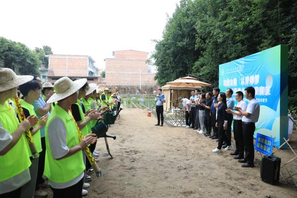 与会领导躬身耕耘种菜苗
