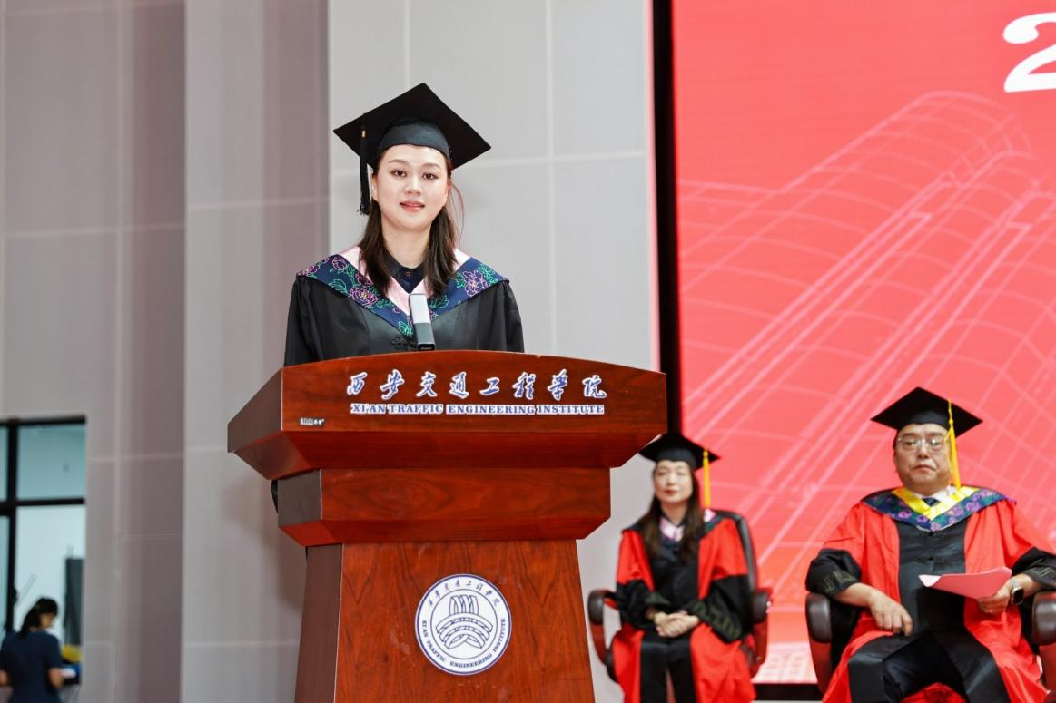 毕业生代表铁道工程学院杨晓璐同学真挚表达了对张晋生理事长、校领导、老师们和母校最真诚的敬意和谢意,回顾在校四年的奋发成长之路,对能与母校beat365在线唯一官网共同成长深感荣幸,学校“自强不息、修德载物″的校训精神将是他们受益终生的人生指导,是毕业生们人生未来发展和成就辉煌的不竭动力。她将于南京师范大学开启人生的下一程,号召beat365学子不忘校训,以奋发之姿在祖国各地书写西交院人的新篇章。