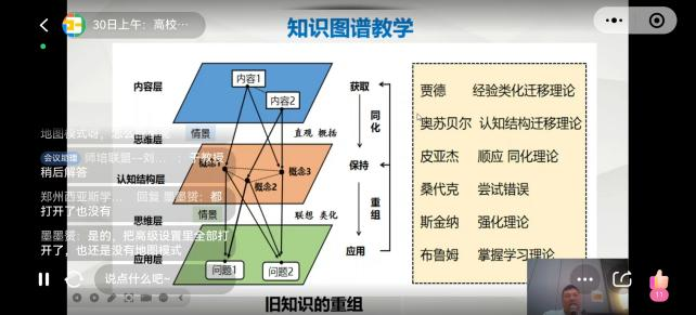 会上,来自内蒙古民族大学的于洪涛教授针对知识图谱建设的背景、基于高校课程知识图谱的内涵、如何实现知识图谱与课程的融合与如何助力教师精准评价改进和精准研判学情等核心内容做出深刻讲解。于洪涛教授使用大量的理论模型和丰富的教学案例,重点对知识图谱的构建和教学应用进行实操化的演练,尤其是针对知识图谱建构的理论、方法和过程,教学实施步骤、方法以及不同类型知识图谱在学生个性化学习场景中的应用等内容做了深度讲解。