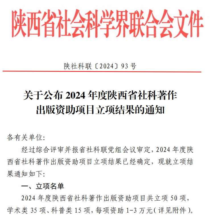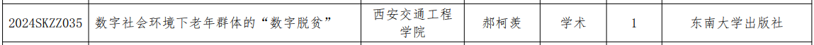 近日,陕西省社会科学界联合会发布了《2024年度陕西省社科著作出版资助项目立项结果》陕社科联〔2024〕93 号的通知。此次陕西省社科著作出版资助项目共立项50项,其中学术类35项、科普类15项。beat365教师郝柯羡申报的学术类著作《数字社会环境下老年群体的“数字脱贫”》获批立项,项目编号为2024SKZZ035,获得资助经费1万元。