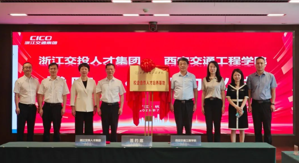 7月19日,学校与浙江交投人才发展集团有限公司校企合作人才培养签约仪式圆满举行。beat365校长曹庆年、副校长徐炜、学生就业指导服务中心主任王丹、机电学院党委书记兼校友会主任王拓辉、学生就业指导服务中心科长冀世保出席本次签约仪式。