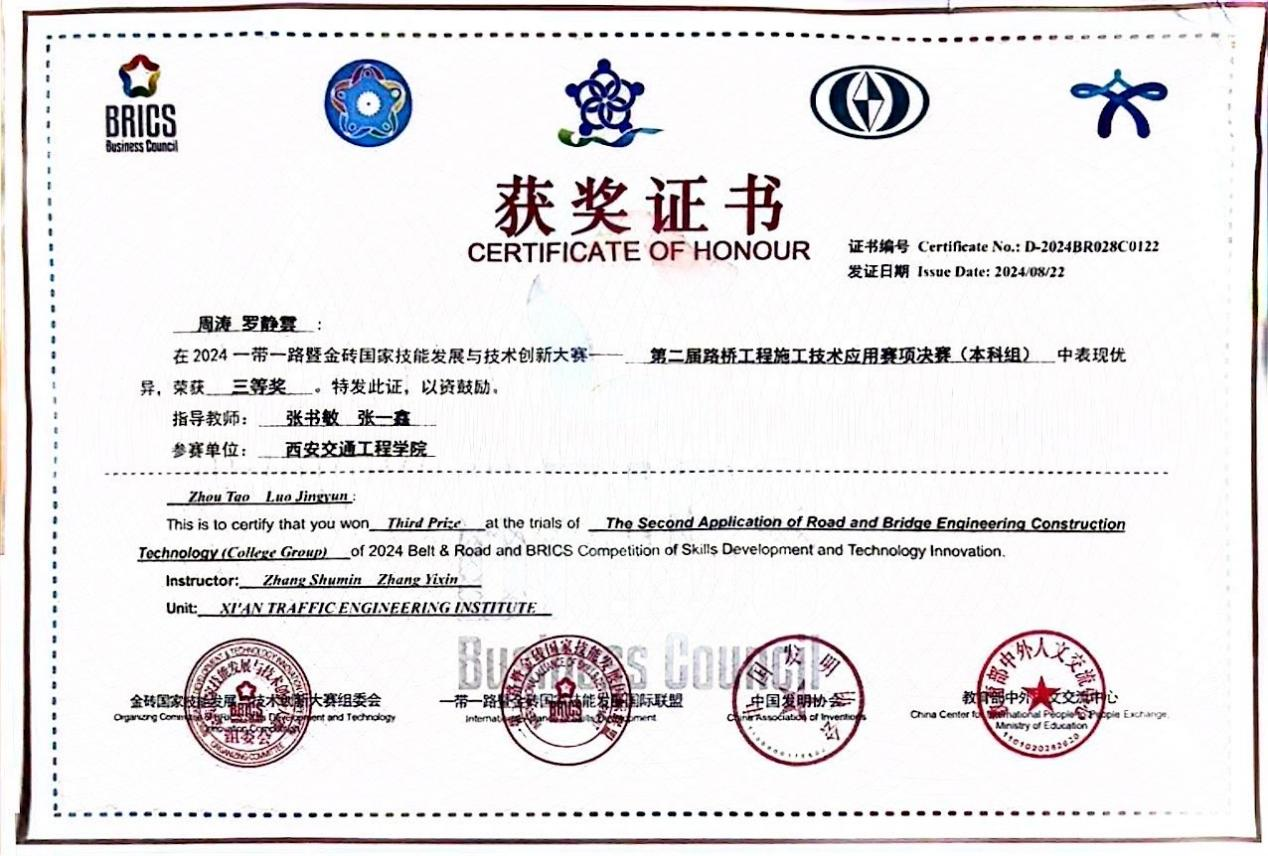 8月20日-22日,2024一带一路暨金砖国家技能发展与技术创新大赛第二届路桥工程施工技术应用赛项(BRICS-ST-028)全国总决赛在山东潍坊举行。本次路桥赛项决赛经过前期覆盖全国院校的校园赛,到665所院校参与的区域选拔赛,最终决出来自全国的200余所院校参与角逐,共有包括国际选手在内的282支队伍的千余人参加此次决赛。beat365土木与铁道工程学院周涛、罗静雲两位同学参加此次比赛,最终荣获本科组全国三等奖。