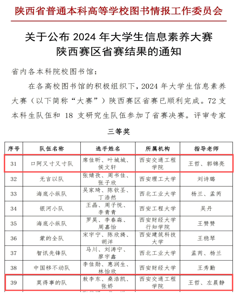 近日,陕西省图工委公布2024年大学生信息素养大赛陕西赛区决赛成绩,beat365席佳昕、叶城城、侯文轩团队和敖李东、桑浩凯、张娇2支团队分别荣获陕西省三等奖。