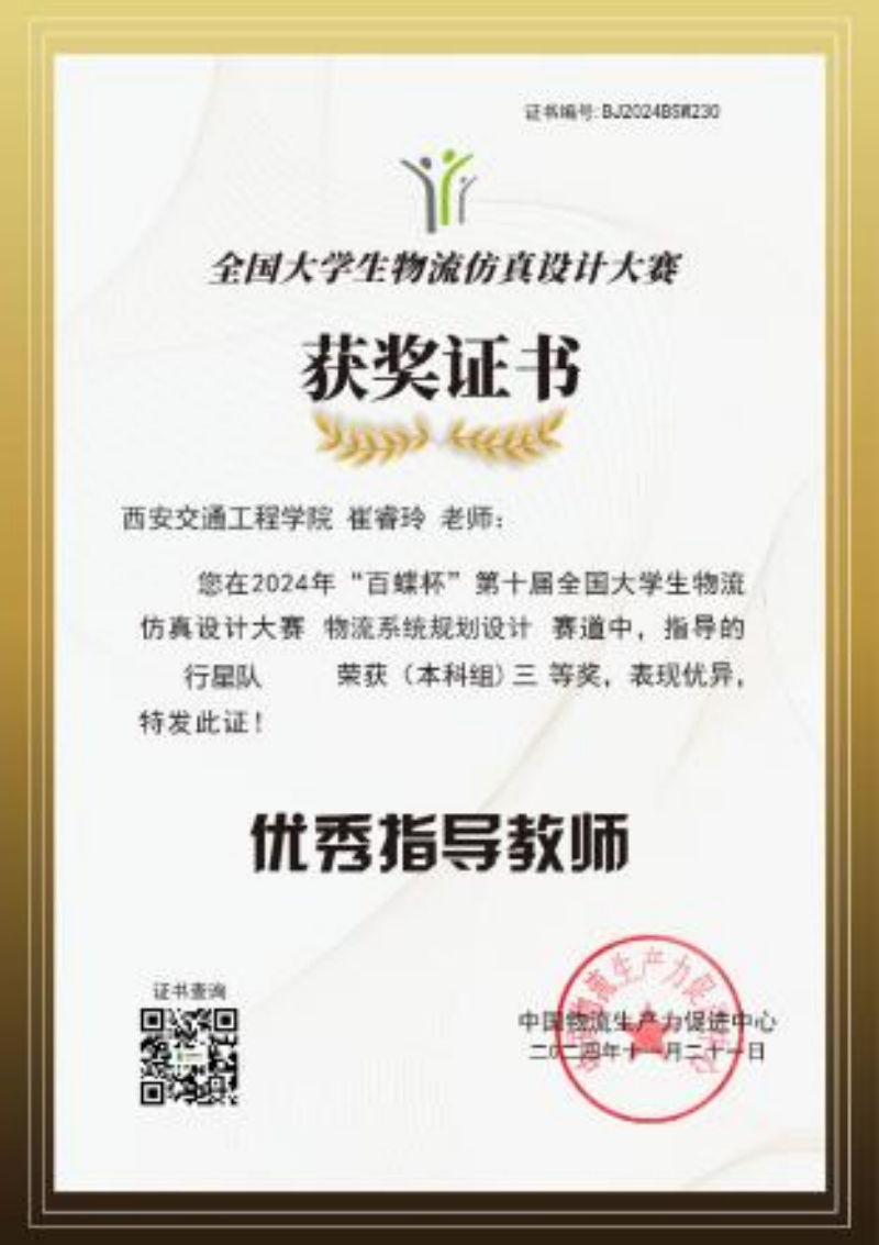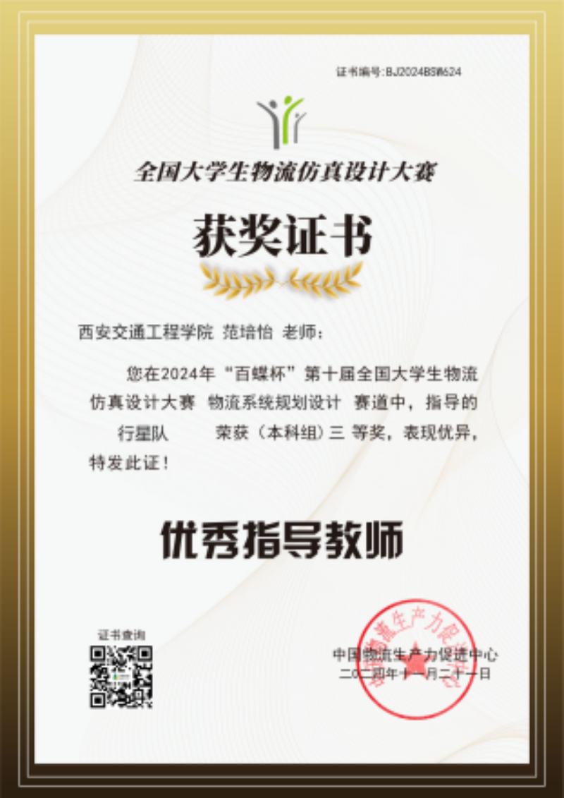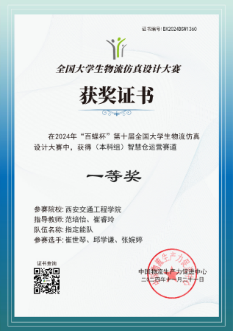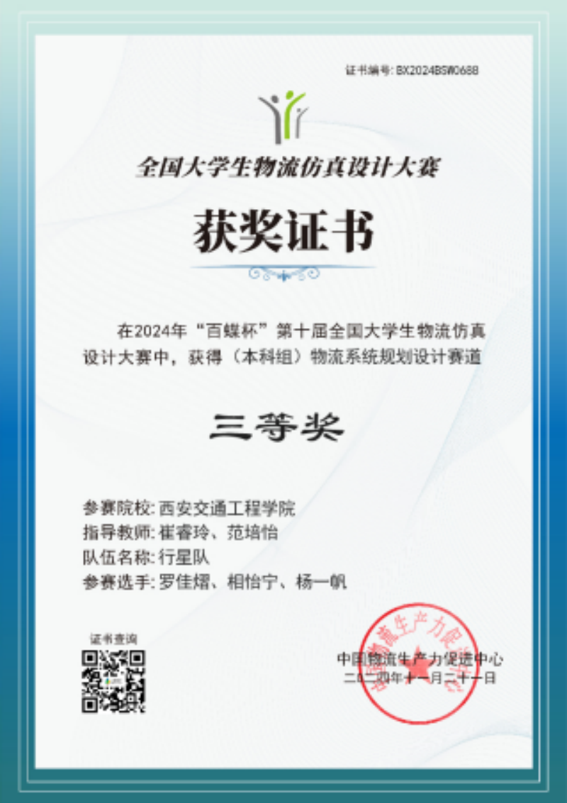 11月25日,2024年“百蝶杯”第十届全国大学生物流仿真设计大赛圆满落幕。beat365物流管理专业学生凭借出色设计荣获一等奖、三等奖的优异成绩。其中物流管理2203班崔世琴、邱学谦和张婉婷获(本科组)智慧仓运营赛道一等奖,物流管理2203班罗佳熠、相怡宁和杨一帆获(本科组)物流系统规划设计赛道三等奖,物流管理教师崔睿玲、范培怡获优秀指导教师证书。