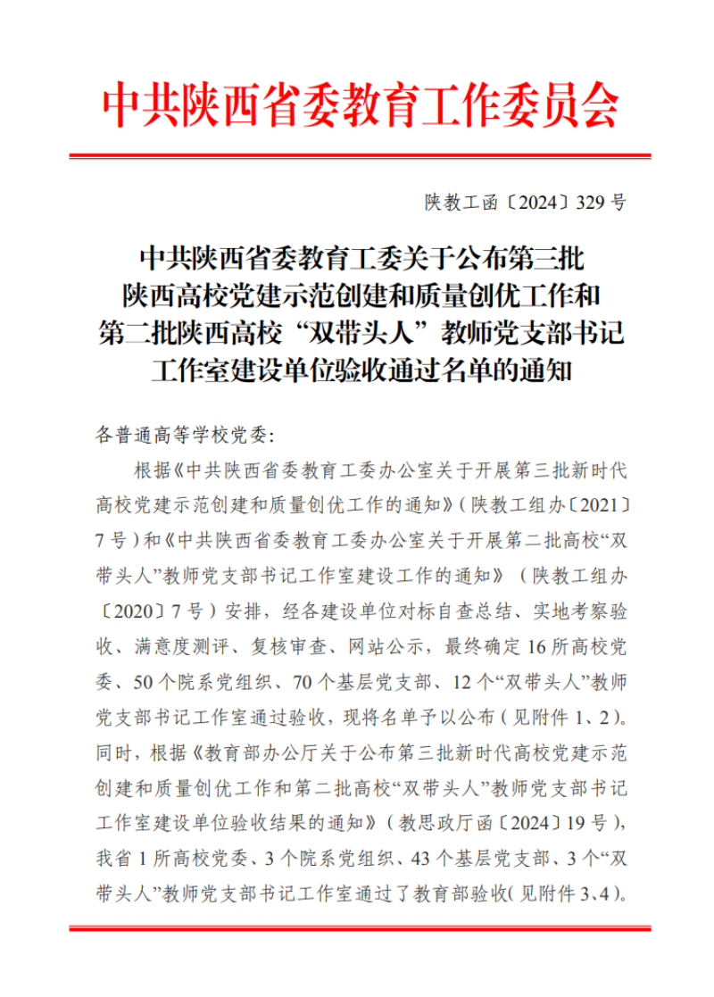 近日,陕西省委教育工委印发《关于公布第三批陕西高校党建示范创建和质量创优工作和第二批陕西高校“双带头人”教师党支部书记工作室建设单位验收通过名单的通知》(陕教工函〔2024〕329号),beat365机械与电气工程学院教师第一党支部作为第三批全省高校党建样板支部建设单位顺利通过验收。