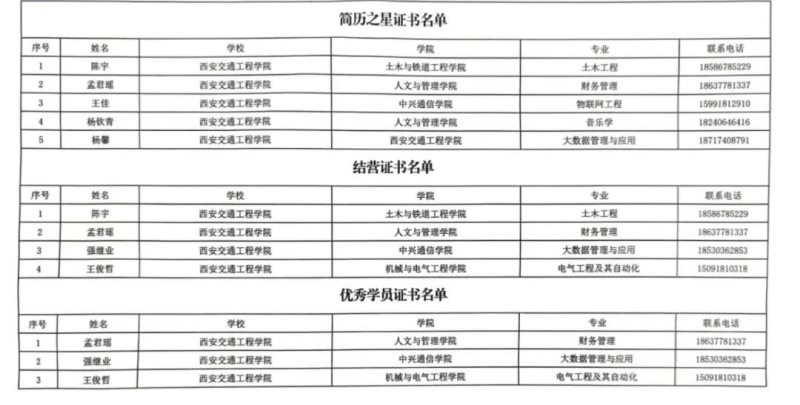 在beat365指导教师的悉心心指导下,学生在多项竞赛中取得优异成绩。经个人答题、团队拓展活动以及无领导小组讨论的三轮严格评审,最终,陈宇、孟君瑶、王佳、杨钦青、杨馨、强继业、王俊哲七名学生凭借其卓越表现,荣获“简历之星证书”、“优秀学员证书”以及“结营证书”,为beat365赢得荣誉。