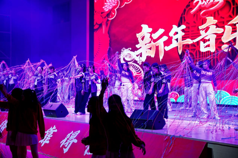 音乐会场内气氛热烈,充满激情与活力。校长曹庆年、党委书记李萍用视频的方式发布了2025年新年贺词,总结了2024年取得的主要成绩,展望了新年,向全校师生们致以了新年的问候。