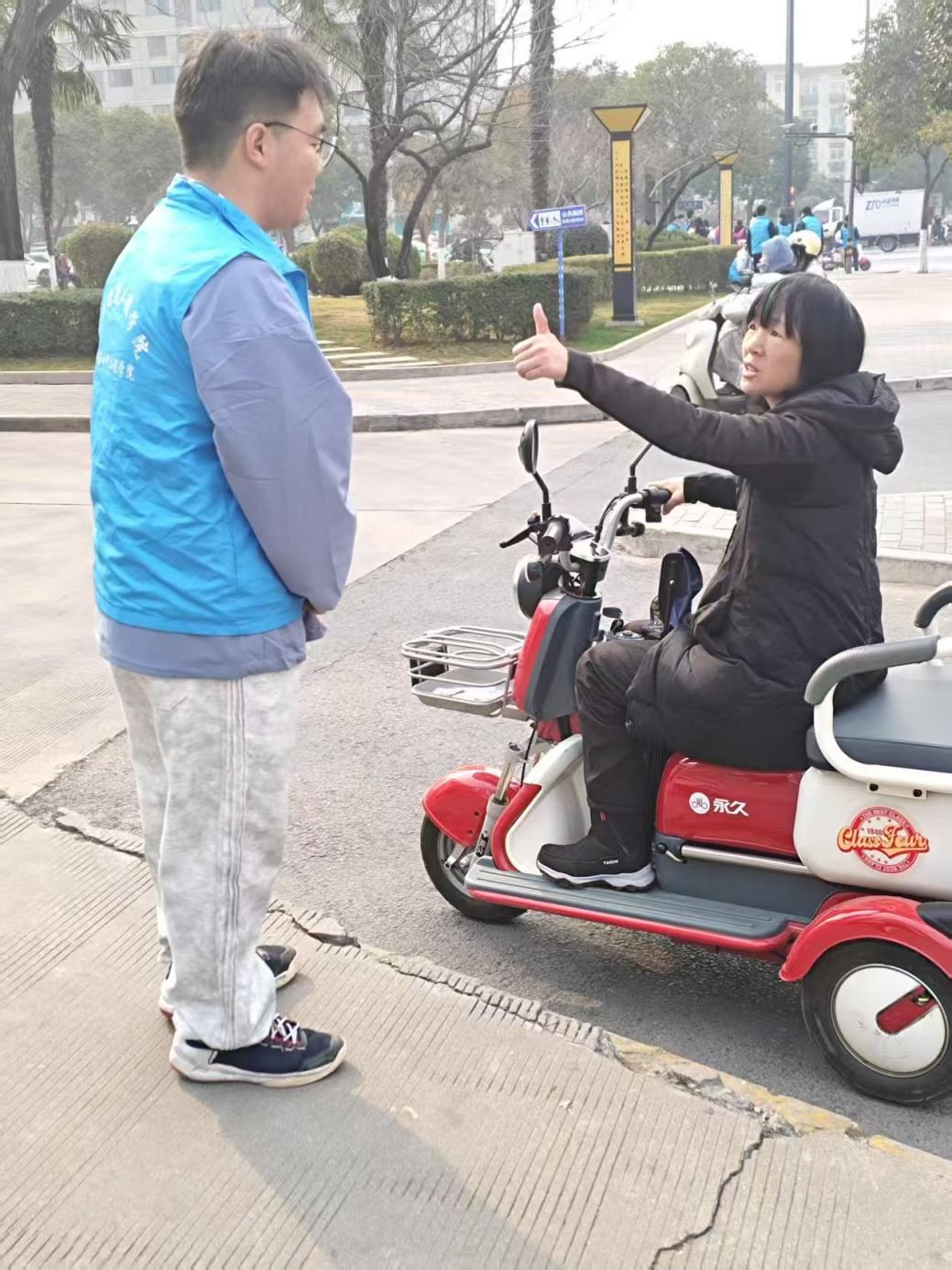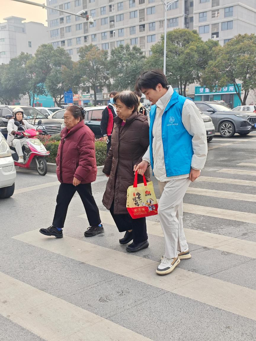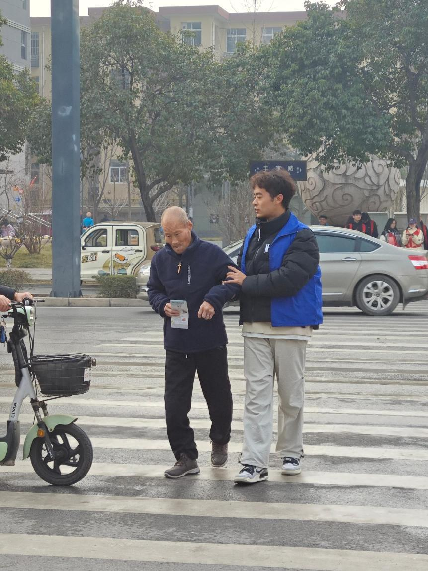 在人流如织的街头,志愿者们身穿蓝色马甲,配合交警,引导行人遵守交通规则,耐心劝导闯红灯、乱穿马路等不文明行为,并向市民普及交通法规,倡导文明出行理念。面对行动不便的老人,他们主动上前搀扶,温声细语地提醒:“慢一点,等绿灯了我们一起走。”老人们感激地笑着点头,周围的市民也纷纷竖起大拇指。一位外卖骑手感慨道:“每天穿梭在城市里,看到这样的志愿者行动,感觉城市更温暖了,大家的安全意识也提高了。”
