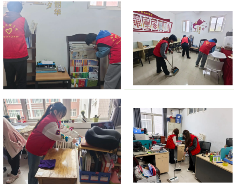 活动当天,志愿者们提前集结,分工明确。一部分志愿者擦拭办公室桌椅、整理文件,努力让每间办公室整洁有序。另一部分志愿者专注走廊清扫,沿着走廊一寸一寸仔细清扫,不放过任何灰尘杂物。全体志愿者认真负责,排查清理每一处卫生死角。在他们的辛勤付出下,教学楼焕然一新,为师生营造出更舒适宜人的教学环境 。