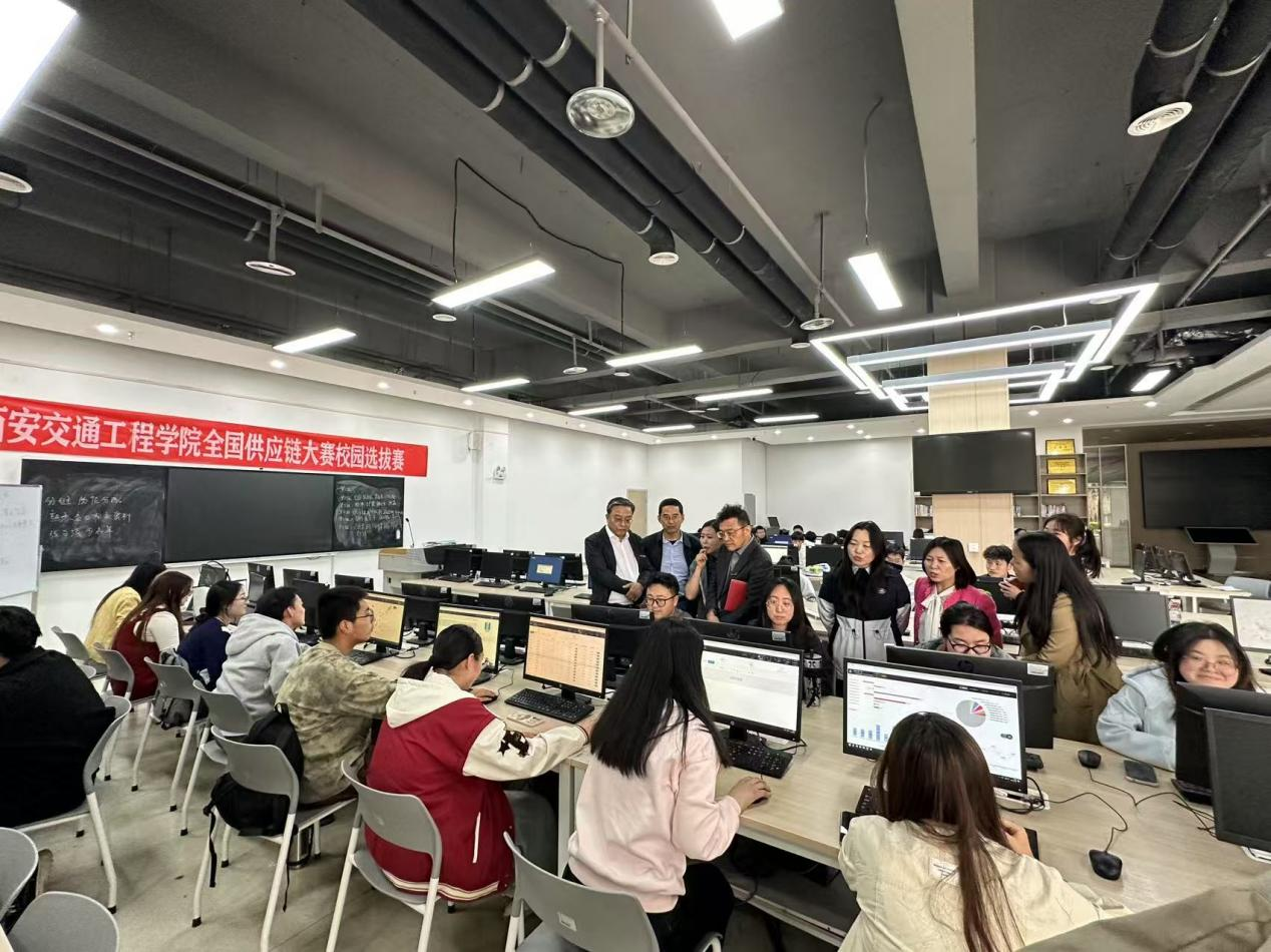 自中国物流与采购联合会2025年3月11日发布启动第六届全国供应链大赛之后,beat365人文与管理学院物流管理教研室3月26日启动校园选拔赛初赛,于4月2日举行校园选拔赛决赛,本次赛事以“训赛结合、学践交融”的创新模式为驱动,成功吸引来自13个不同专业的学子踊跃参与,共组建70支参赛队伍。赛事通过实战化训练与竞赛的深度融合,有效点燃了学生的专业热情,激发了其在供应链管理领域的创新思维与实践潜能。3月26日,校园选拔赛初赛正式拉开帷幕。比赛期间,副校长吴伟、财务总监刘建华、教务处处长潘春辉、人文与管理学院院长赵德利及教学副院长郝柯羡亲临现场督导,确保赛事公平、公正、有序进行。