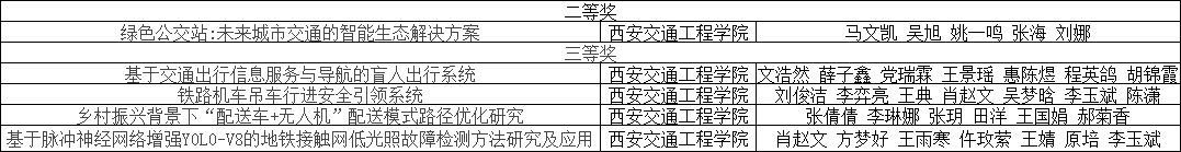 我院参赛团队在比赛中展示了扎实的专业知识和创新的研究成果,赢得了评委高度评价。其中,《绿色公交站:未来城市交通的智能生态解决方案》获得二等奖;《铁路机车吊车行进安全引领系统》、《乡村振兴背景下“配送车+无人机”配送模式路径优化研究》、《基于脉冲神经网络增强Y0L0-V8的地铁接触网低光照故障检测方法研究及应用》、《基于交通出行信息服务与导航的盲人出行系统》获得三等奖。这些获奖项目不仅体现了学校在交通领域的教学和科研实力,也展示了学生在解决实际交通问题中的创新思维和实践能力。