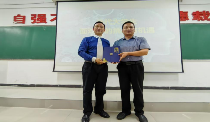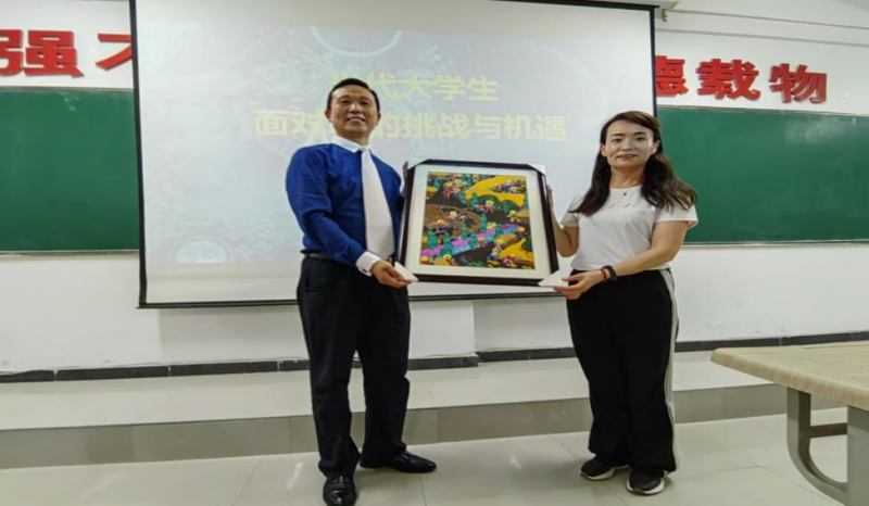 人文与管理学院党委书记李沙沙对杜志的到来表示热烈欢迎,并向其赠送纪念品。她强调,面对AI技术的迅猛发展,当代大学生亟需拓展视野、提升核心竞争力,希望同学们通过本次讲座能够深入思考科技与人文的融合路径。