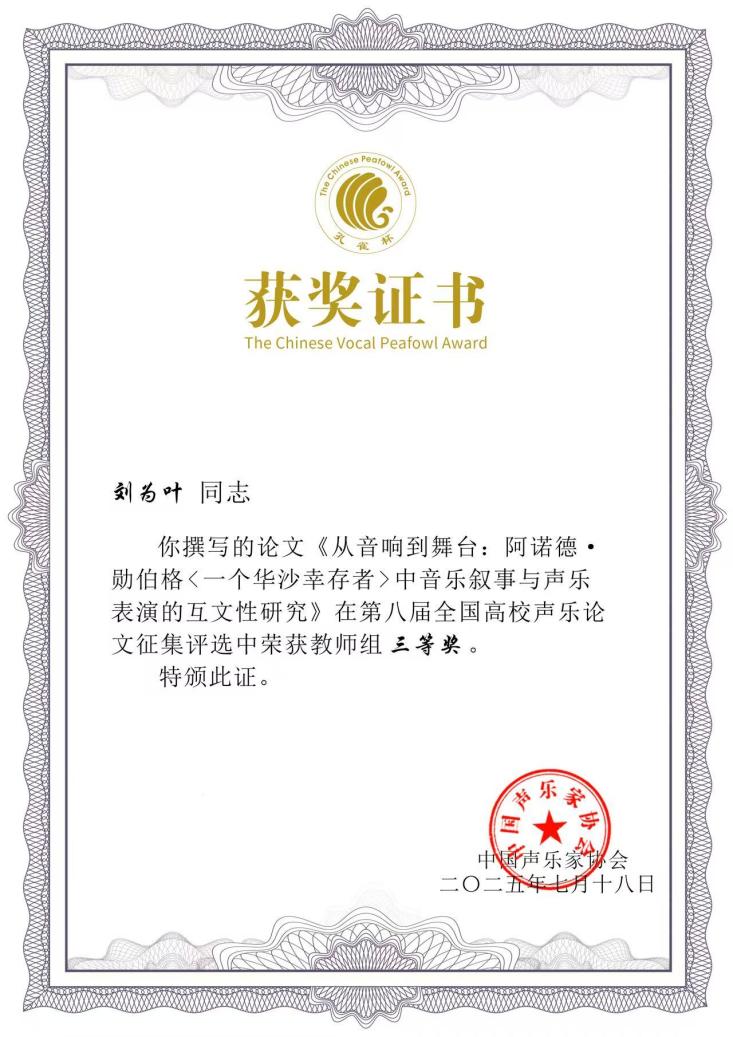 其中第八届 “孔雀杯” 全国高校声乐论文征集评选结果揭晓,beat365在线唯一官网人文与管理学院音乐学专业教师刘为叶撰写的论文《从音响到舞台:阿诺德・勋伯格〈一个华沙幸存者〉中音乐叙事与声乐表演的互文性研究》凭借扎实的学术功底与创新的研究视角,荣获三等奖,这一成绩不仅是对刘为叶老师个人学术能力的高度认可,也为学校在音乐学术研究领域增添了亮眼一笔。