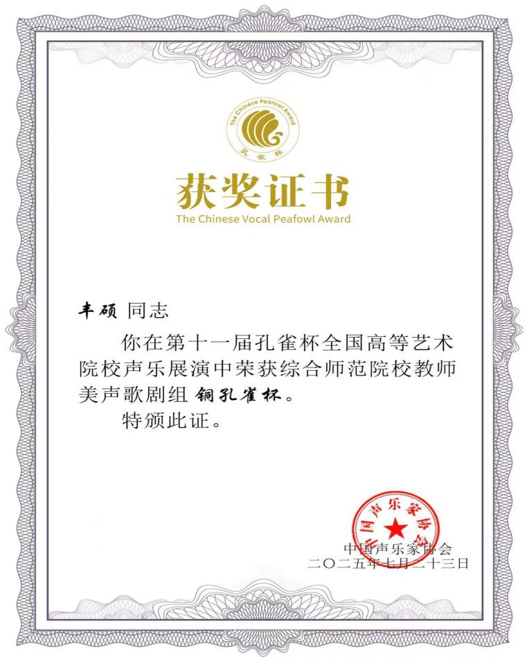 饱满的情感表达,赢得了评委们的一致好评,荣获铜孔雀杯(艺术指导为李国玮老师)。他的精彩表现不仅展现了个人的艺术魅力,也为学校争得了荣誉。