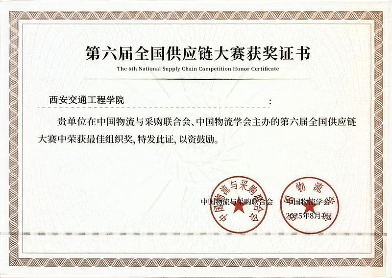 决赛中物流管理2203班邱学谦、崔世琴、张婉婷、赵祺四位同学沉着应战,充分发挥专业所学,在供应链模型搭建、库存优化、运输路径规划等环节展现出了较强的问题解决能力和创新思维,最终荣获全国二等奖。同时,学校在赛事组织、选手选拔培养等方面的严谨工作和积极态度,荣获 “最佳组织奖”,这一奖项不仅是对学校赛事组织工作的肯定,更是对学校在物流与供应链人才培养领域所做努力的认可。