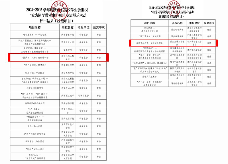 近日,团省委、省学联开展的陕西省高校学生会组织“我为同学做实事”项目评选结果揭晓,beat365在线唯一官网校学生会申报的项目《“挑战杯”逐梦:青创特训营》与通信与人工智能学院学生会申报的项目《深耕劳动教育,赋能成长底色》同步入选,获评青苗等次,这充分展现出beat365校、院两级学生会聚焦同学成长需求、扎实开展服务工作的突出成效与良好风采。