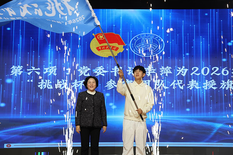 在庄重的乐曲声中,党委书记李萍为2026年“挑战杯”创业计划竞赛的参赛团队代表授旗。挥舞的旗帜象征着使命的传递与责任的担当,点燃了全场师生迎接新挑战、再创新辉煌的奋斗激情。