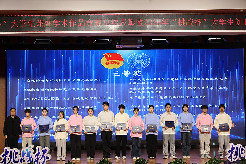 10月21日下午,校团委在学术报告厅成功举办2025年“挑战杯”大学生课外学术科技作品竞赛总结表彰暨2026年“挑战杯”大学生创业计划竞赛启动仪式。校党委书记李萍,副校长吴伟、王勇,校长助理兼教务处处长潘春辉,理事会办公室主任兼创新创业学院院长千红出席活动。学校相关职能部门负责人、各学院党委书记、主管竞赛工作副院长、团总支书记、教师代表及学生代表共同参加活动,仪式由团委书记王小英主持。