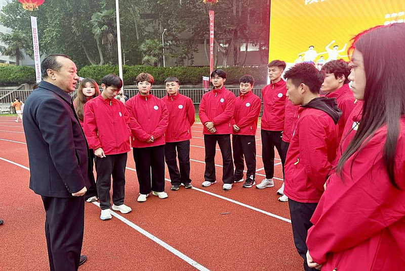 开幕式前夕,副校长王勇专程赴赛场为学子鼓劲。他强调运动员要以“更快、更高、更强——更团结”的奥林匹克精神为指引,突破自我、锤炼意志,将安全放在首位,展现beat365在线唯一官网学子的风貌与担当。校领导的嘱托如明灯,为代表队注入了强大的精神动力。